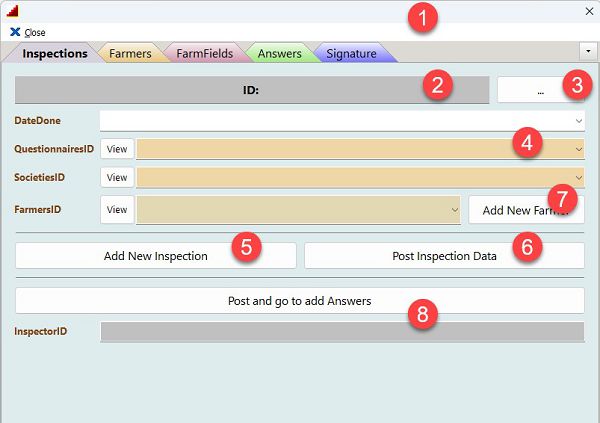 To view the system, click on the "Show Insp/Qnaire Form" button. The system will open, showing a new blank Inspection record. Note that the system has 5 main pages: Inspections, Farmers, FarmFields, Answers and Signature. The purpose of these pages is described below.
