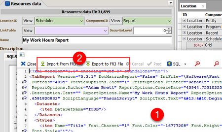 Viewing ObjectProperties The OjectProperties are displayed in their own specialized Syntax Editor. This displays the data with suitable formatting. Reports are stored as XML (shown at 1., in the image). Note that you can import and export this XML to files on disk via buttons on the form (shown at 2., in the image) |